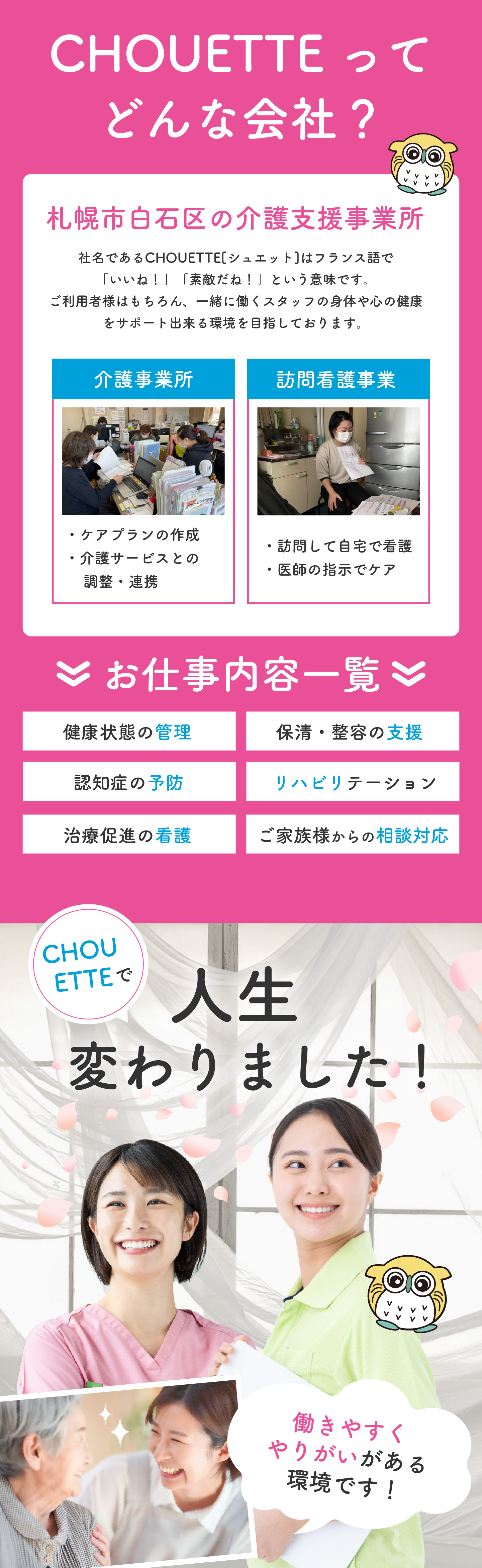 | 電話番号 | 011-856-6061(居宅介護支援事業所シュエット) 011-856-6502(訪問看護ステーションシュエット) |